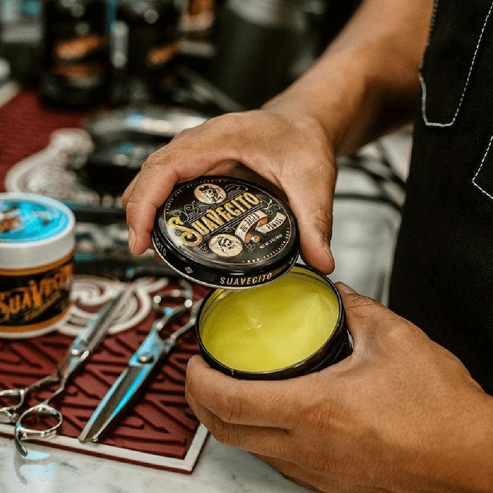 It’s finally here. Suavecito Oil Based Pomade has been long-requested by those who want a pliable, but long-lasting hold with an old school feel. Three simple ingredients expertly blended together to create a pomade that will help you achieve your perfect look. This Oil Based Pomade provides a healthy shine and a controlled hold on any hair type. Use it on even the most unruly, thick hair to achieve your desired style – from a smooth slickback to a perfect pomp. We already know what your next question is, and yes, this has our original Suavecito scent.